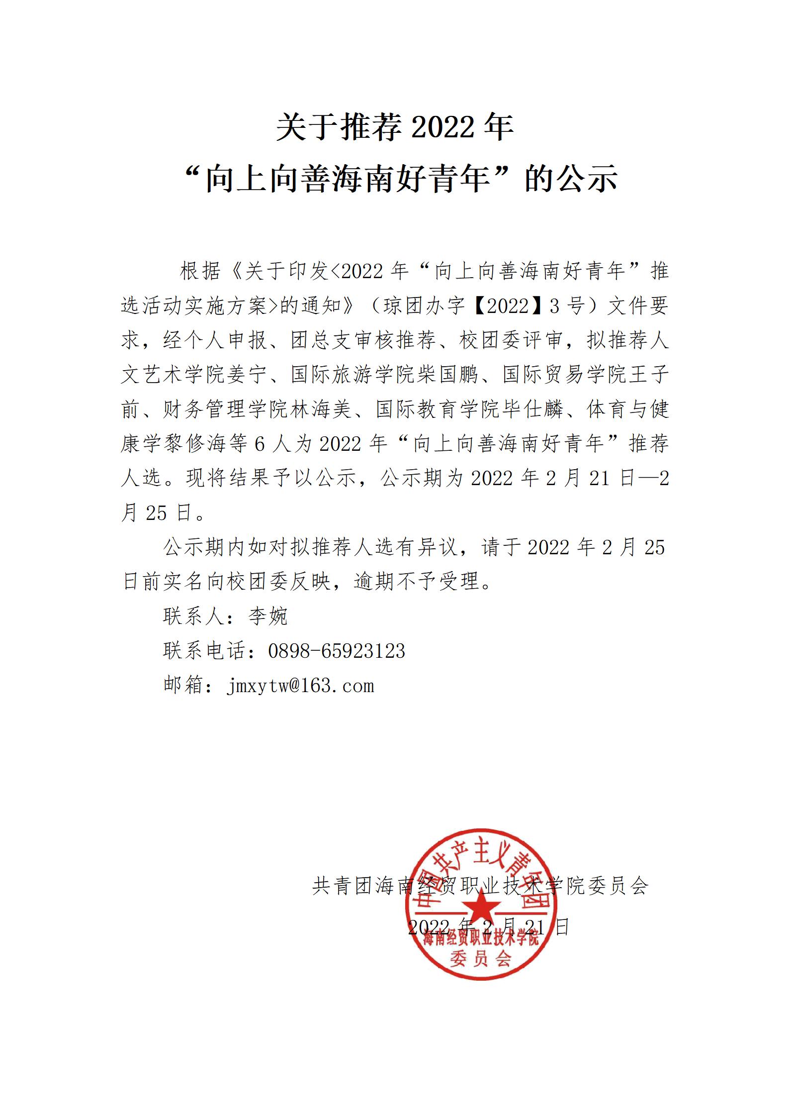 关于推荐2022年“向上向善海南好青年”的公示