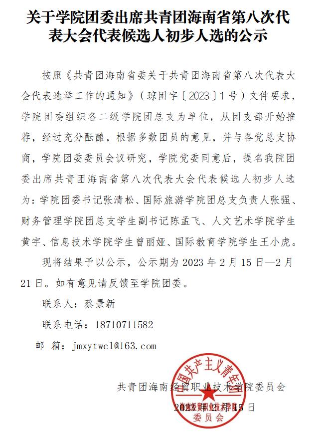 关于出席共青团海南省第八次代表大会代表候选人初步人选的公示
