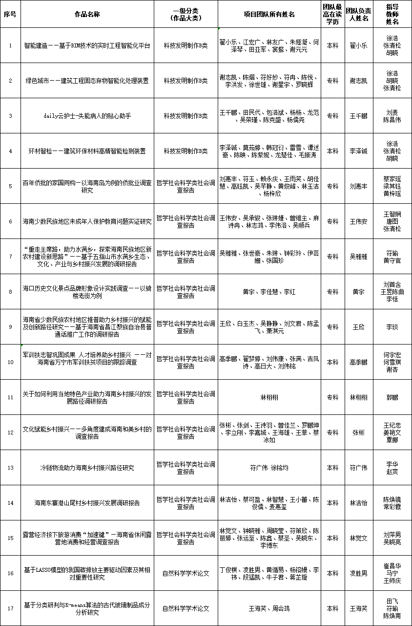 共青团9428cn太阳集团古天乐委员会按照《关于组织开展第十一届“挑战杯”海南省大学生课外学术科技作品竞赛的通知》要求,组织校赛项目进行现场答辩,经校内外专家评审指导,得出我校推荐参加第十一届“挑战杯”海南省大学生课外学术科技作品竞赛结果。现予以公示: