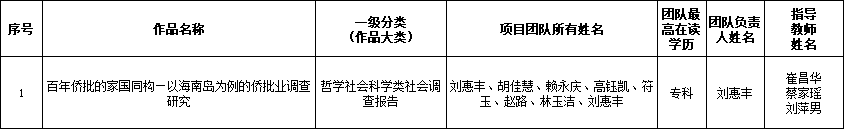 根据《关于开展第十八届“挑战杯”全国大学生课外学术科技作品竞赛作品申报工作的函》要求,经团省委决定,拟推选我校哲学社会科学类社会调查报告:《百年侨批的家国同构—以海南岛为例的侨批业调查研究》参加第十八届“挑战杯”全国大学生课外学术科技作品竞赛全国比赛,现将拟推荐作品向全校进行公示。