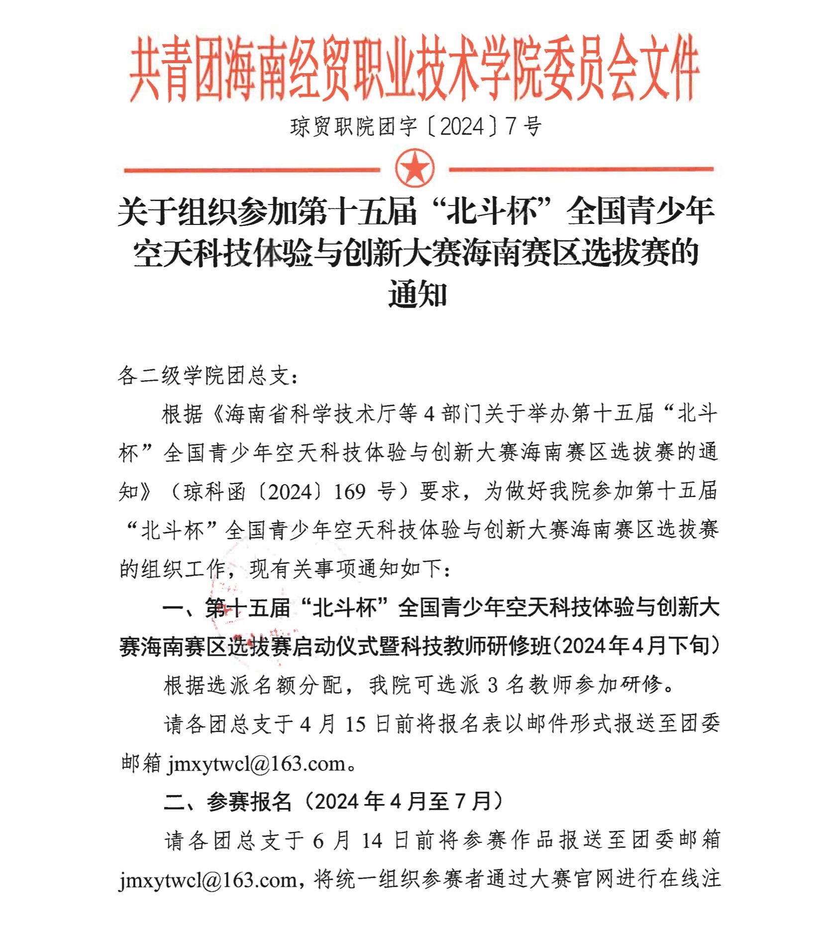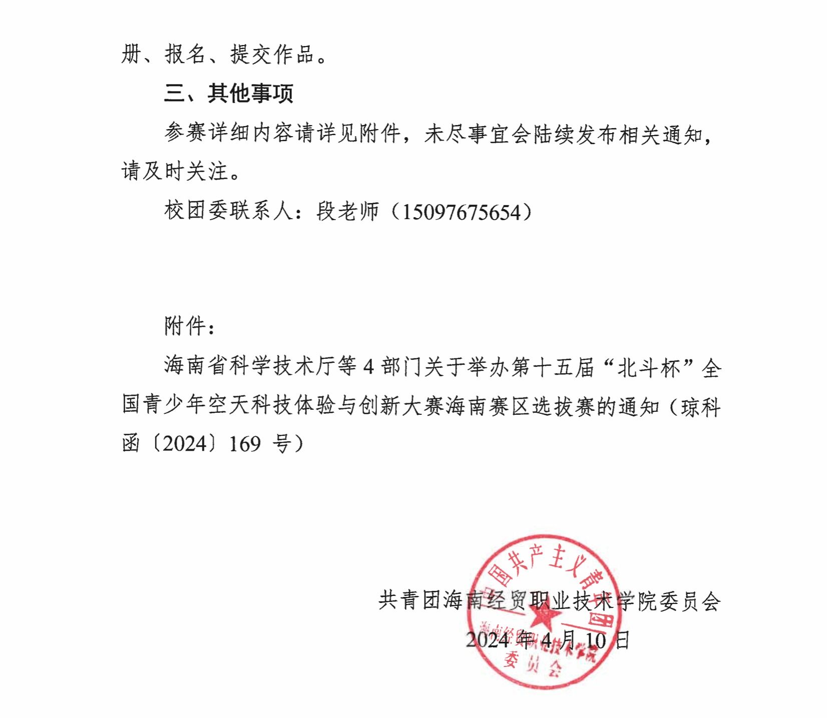 关于组织参加第十五届“北斗杯”全国青少年空天科技体验与创新大赛海南赛区选拔赛的通知