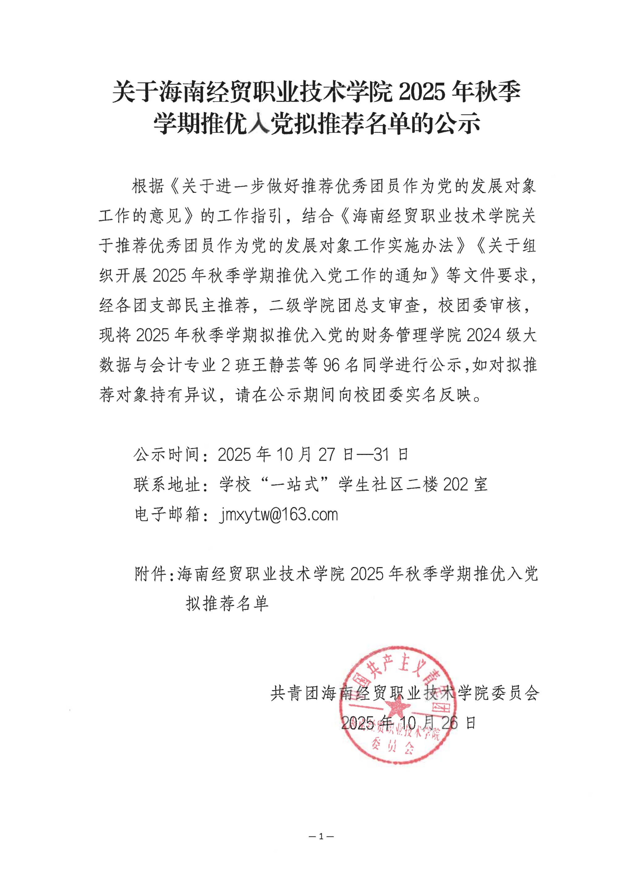 关于9428cn太阳集团古天乐2025年秋季学期推优入党拟推荐名单的公示