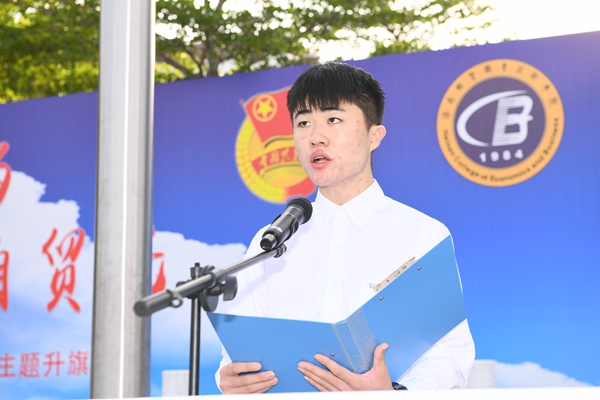 崔昌华在国旗下给同学们讲开学“第一课”。他说,近年来,在全校师生的共同努力下,学校先后取得了中国特色高水平高职学校、国家优质高职院校、全国职业院校实习管理50强、全国职业院校学生管理50强等荣誉称号,位于江东新区的海经贸已经成为自贸港建设的职教先锋,全校青年学子要抓住时代机遇,在自贸港建设的浪潮中逐梦扬帆。