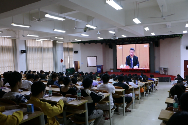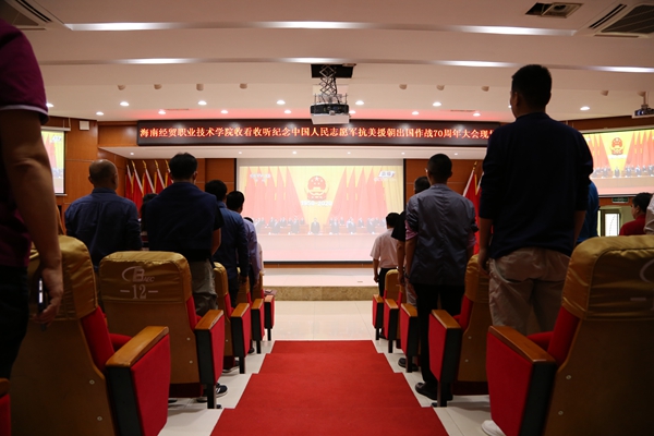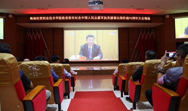 在学术交流中心报告厅,学校领导以及全体中层干部、行政坐班人员认真收看纪念中国人民志愿军抗美援朝出国作战70周年大会盛况直播,聚精会神聆听习近平总书记的重要讲话,用笔用心做好记录,以热烈掌声回应精彩讲话。学校团委组织学生党员、团学干部在团校教室等场所收看大会盛况。各二级学院也分别采取集中和分散等不同形式,组织师生收听收看大会现场直播。