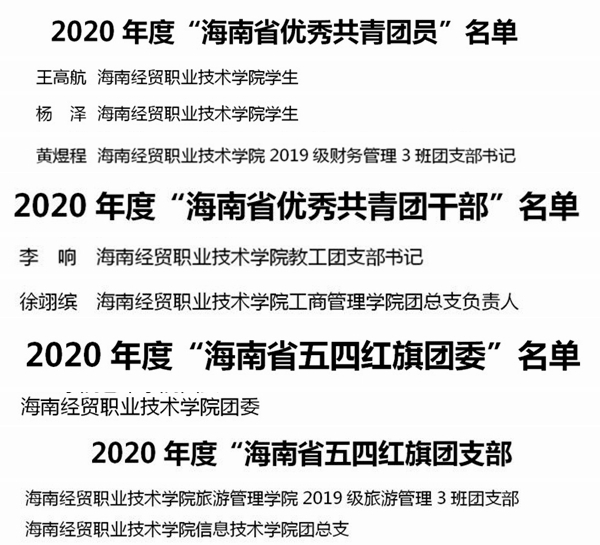 近日,共青团海南省委表彰了一批在2020年以来全省共青团工作中成绩突出的个人和集体。9428cn太阳集团古天乐教师范高智获得第二十七届“海南青年五四奖章”,王高航、杨泽、黄煜程等三位同学获得“海南省优秀共青团员”称号,李响、徐翊缤两位教师获得“海南省优秀共青团干部”称号,校团委获得“海南省五四红旗团委”,旅游管理学院2019级旅游管理3班团支部、信息技术学院团总支获得“海南省五四红旗团支部(团总支)”。