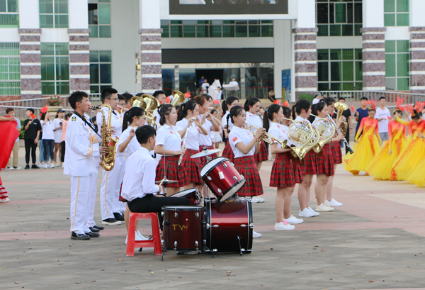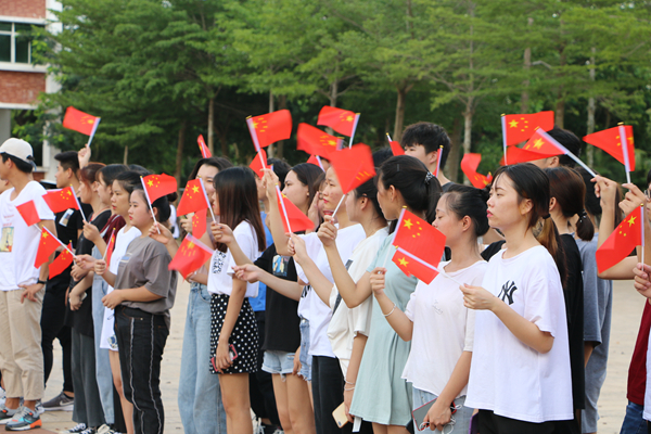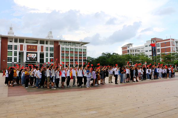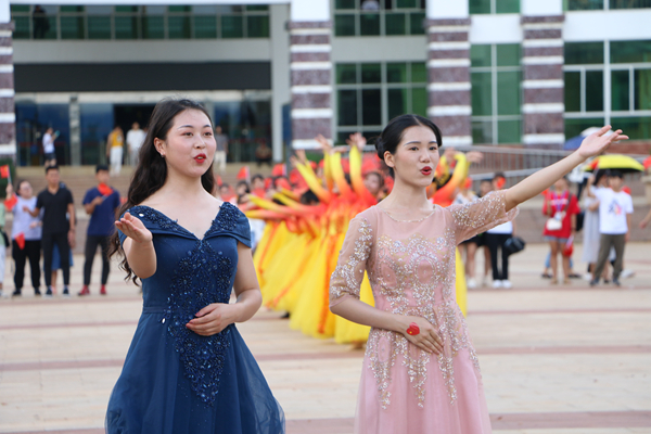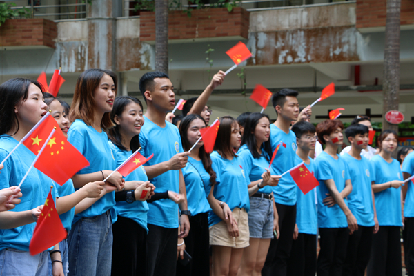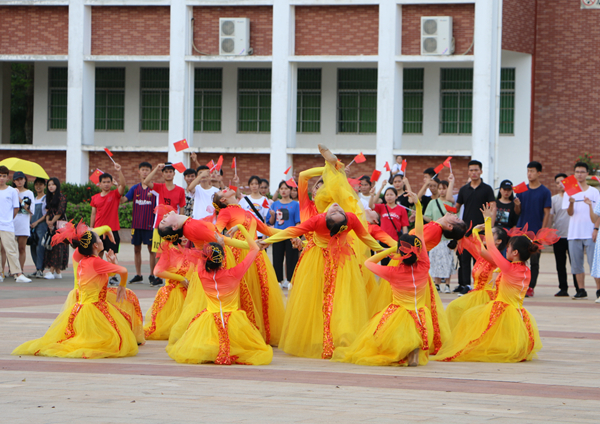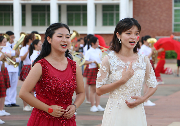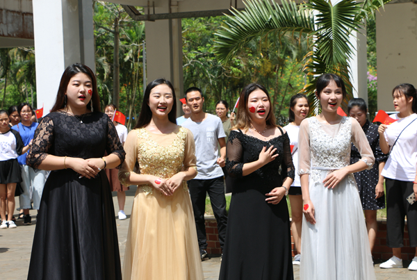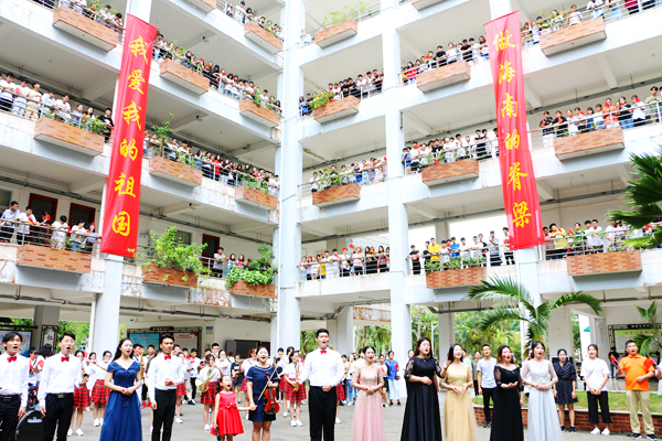 课间,伴随着熟悉的旋律,第一场快闪活动拉开帷幕。主唱同学和乐队从人群中走出,用青春激扬的歌声带动现场观众合唱,深深感染了每一位同学。大家纷纷走出教室,汇聚在走廊,一起跟拍合唱。热情洋溢的脸庞,青春激昂的歌声,优雅动听的弹奏,展现出海经贸学子充满活力、积极向上的精神面貌,抒发着同学们对党和祖国的热爱深情。各二级学院党总支书记与同学们一起引吭高歌,共同为祖国献上最真挚的祝福。一瞬间,嘹亮的歌声在校园内回荡,印有“我爱我的祖国”“做海南的脊梁”的垂幅从教学楼飘下,一张张青春的笑脸,在国旗的挥动中显得格外灿烂。