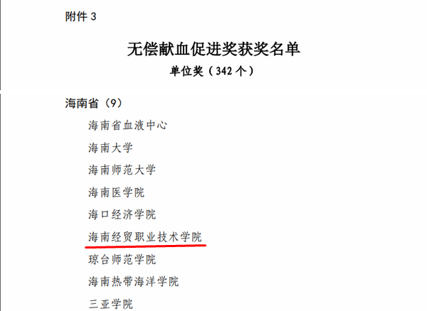 2018年度,海经贸参与献血学生近1410人次,献血人数占在校生人数比率16.49%,在省内高校中仅次于海南医学院,位列高职院校首位。学校将珍惜荣誉,继承特色优势,学习先进经验,一如既往开展好献血工作,认真完成无偿献血任务目标,并结合专业特色,引导学生树立远大志向、追求远大目标,积极承担社会责任的价值追求。