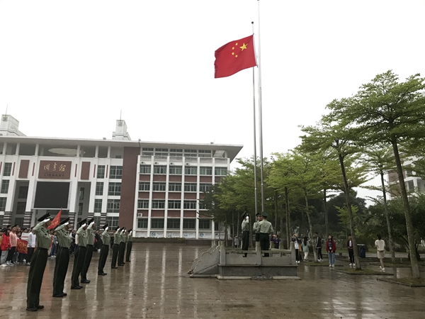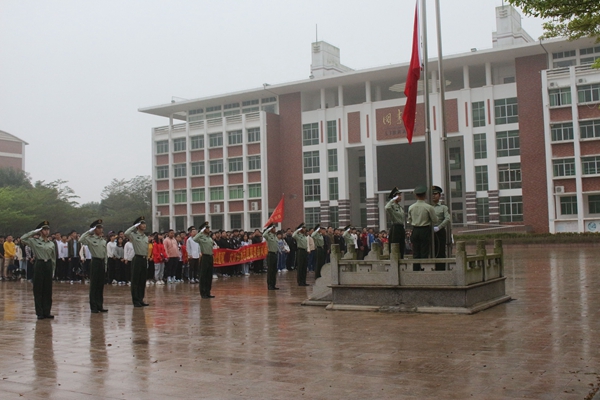 在纷飞的细雨中,国旗班成员迈着整齐而坚定的步伐,护送着鲜艳的五星红旗庄严地入场。伴着《义勇军进行曲》,全体师生齐行注目礼。