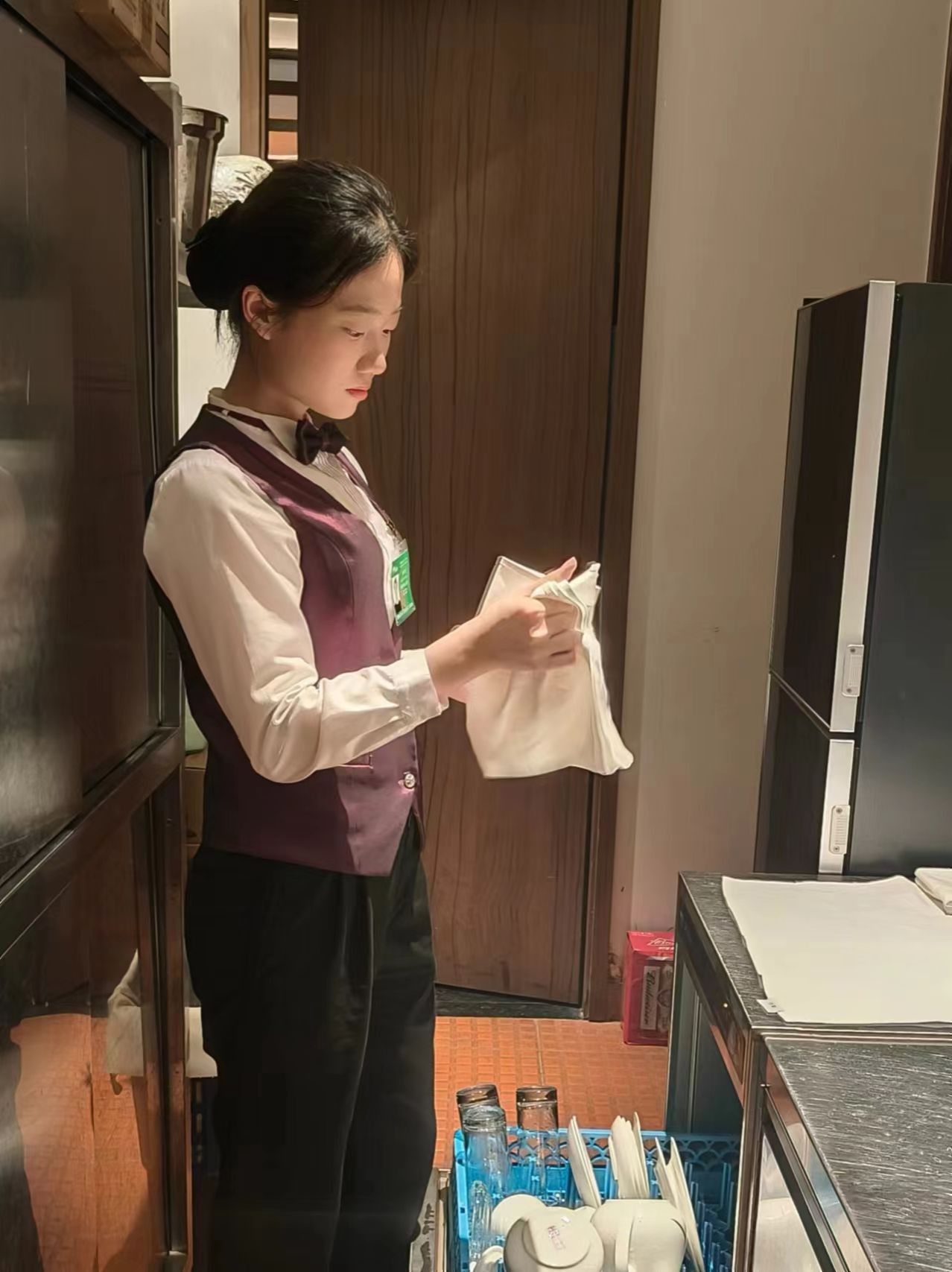 学生志愿者陈凤灵嫣的任务是宴会摆台、接待宾客,期间还需要提供擦洗餐具、酒水服务。她说:“我能够更加从容地回答和应对外宾的各种要求,增加了我的自信心,也提升了我的应变能力。”