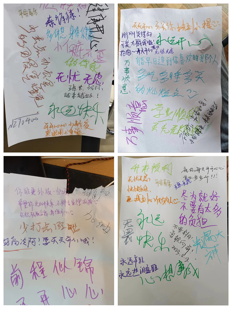 此次心理团辅由4个集体小活动组成,分别是呼啦圈大作战、流年画册、心有千千结、背后的祝福。在活动过程中,大家手拉手,齐心合力运送呼啦圈;背对背用画笔传递信息,专业技能完美展示;纵使乱成一团麻,大家牵手合作也能复原完美圆圈;匿名写下对彼此的祝福,表达平时想说却不好意思说的话。历时2个小时,同学们从一开始的拘谨害羞,到后面的沉浸体验,感受到集体活动带来的愉悦放松。