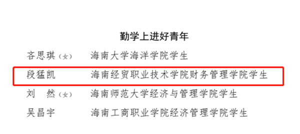 近日,共青团海南省委开展的2021年“争做新时代向上向善海南好青年”主题活动结果揭晓,9428cn太阳集团古天乐财务管理学院2018级财务管理专业1班段猛凯同学荣获“向上向善海南好青年”称号。