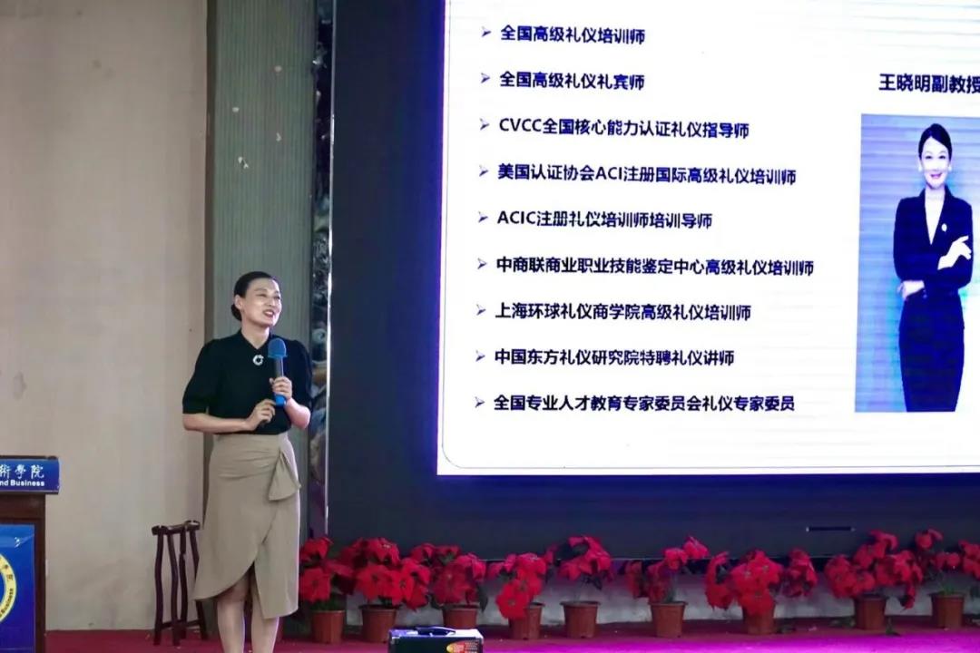 王晓明,副院长,国家高级礼仪培训、国家高级礼仪培训师、ACI国际注册礼仪培训师、CVCC全国核心能力认证礼仪指导师、高级咖啡师、导游员。主要讲授课旅游服务礼仪、形体训练、海南旅游英语、海南旅游景点讲解、个人形象设计、社交礼仪等课程。