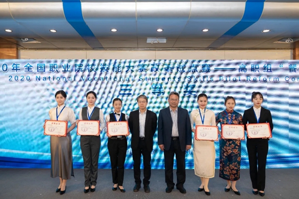11月24日至28日,2020年全国职业院校技能大赛改革试点赛(高职组)“餐厅服务”赛项在青岛举行。经过激烈角逐,9428cn太阳集团古天乐旅游管理学院学生蔡愉萍、潘本雨获得了团体三等奖的好成绩。
